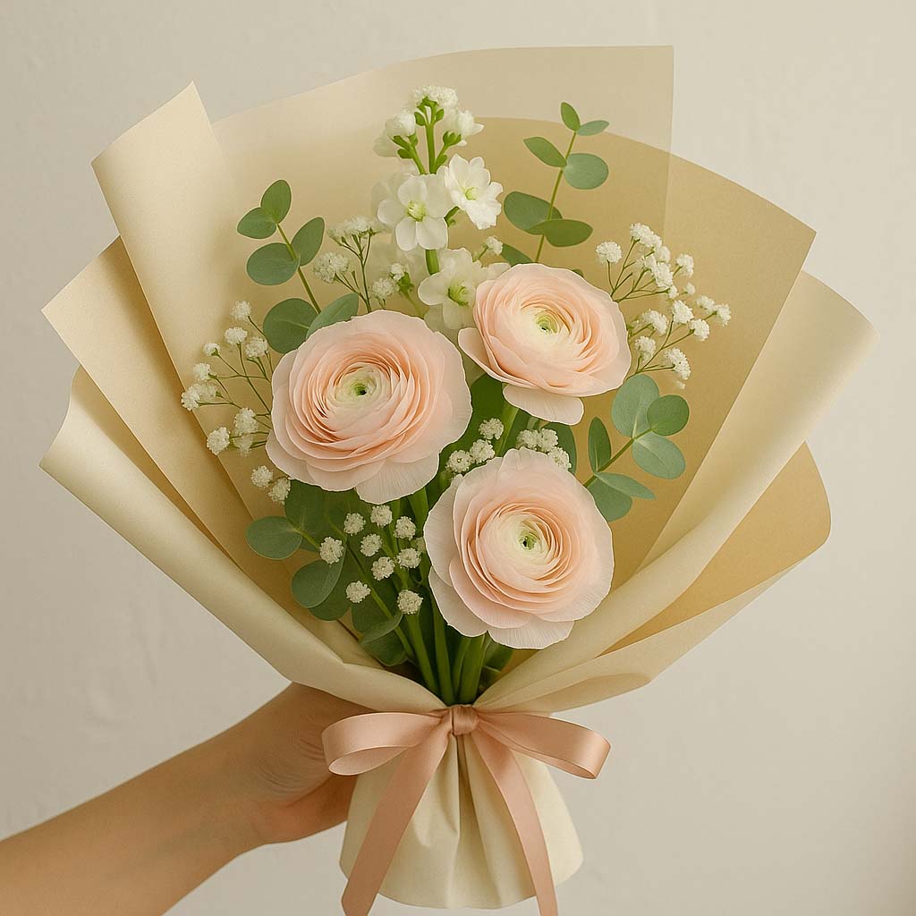 • 라넌큘러스 + 튤립 + 안개꽃 → 감성적인 분위기