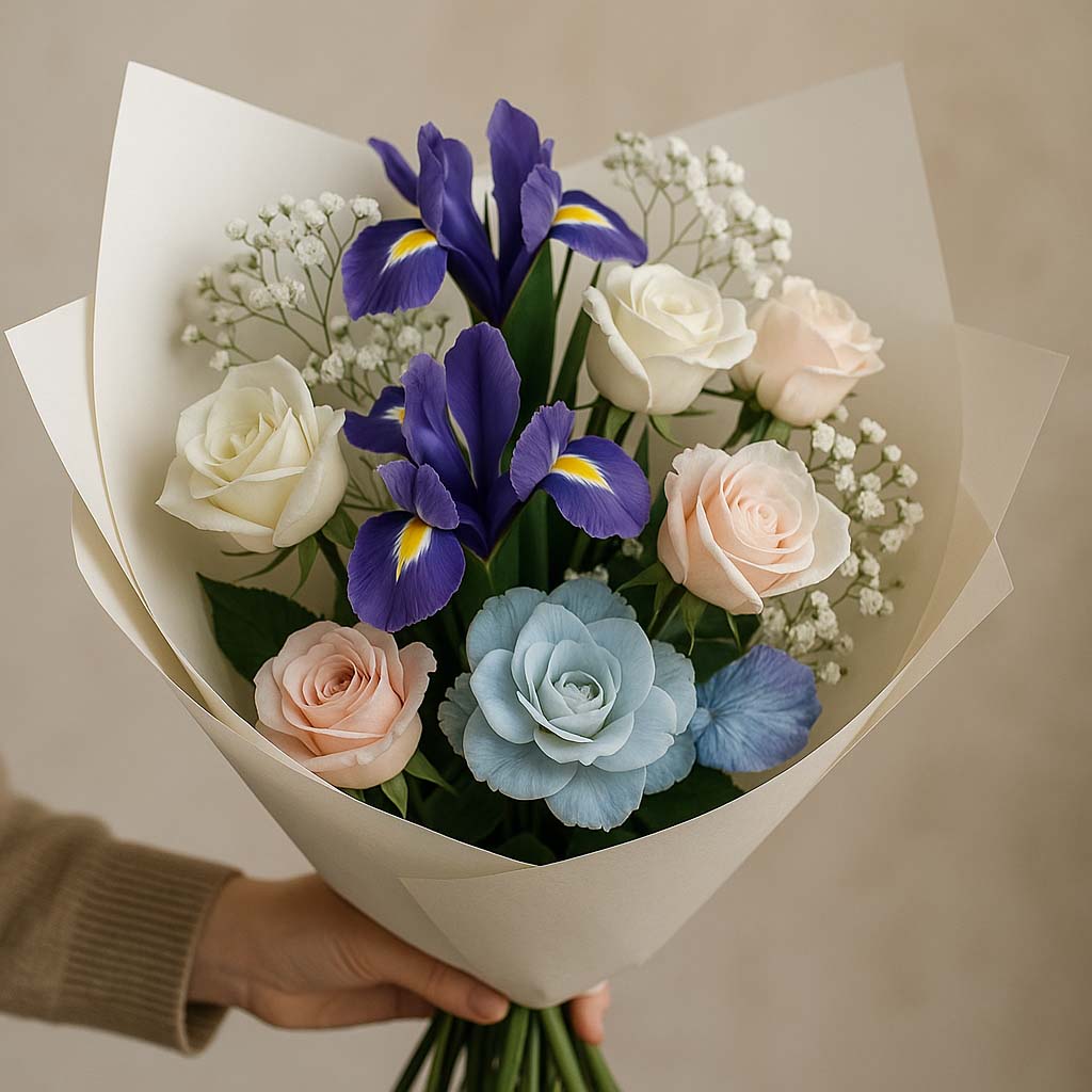 • 아이리스 + 화이트 장미 + 안개꽃 → 존경과 감사 표현