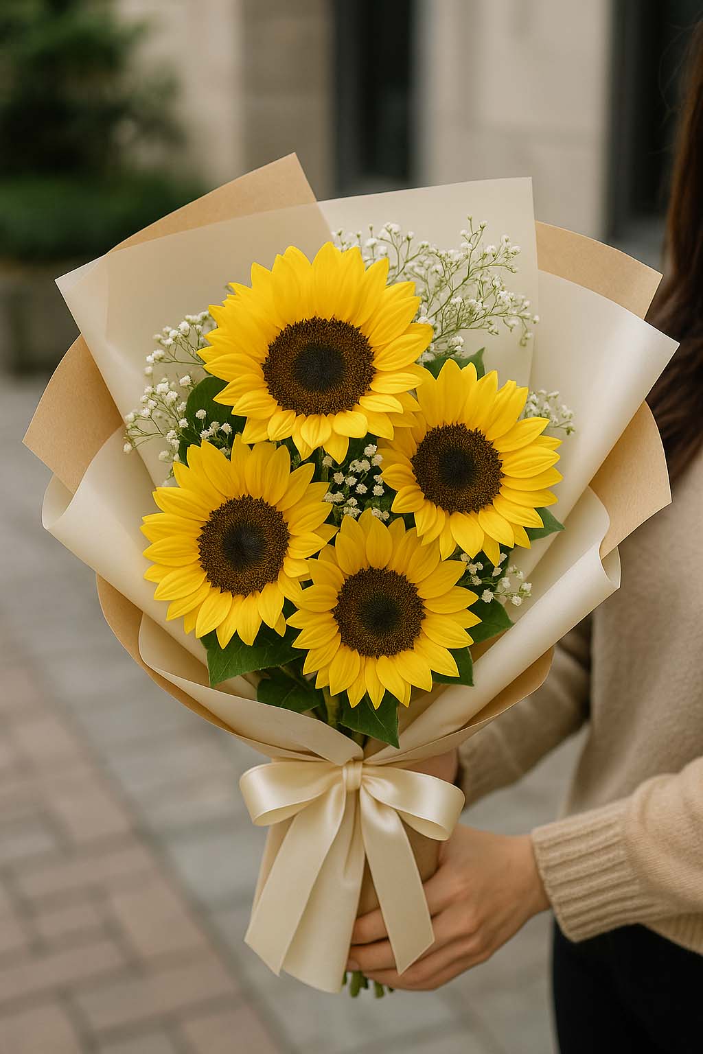 • 해바라기 + 튤립 + 프리지아 → 따뜻하고 긍정적인 분위기