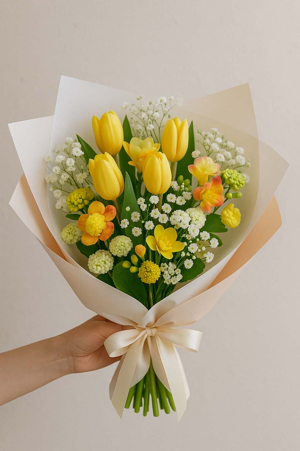 ✔ 프리지아 + 튤립 + 안개꽃 (따뜻하고 감성적인 느낌)